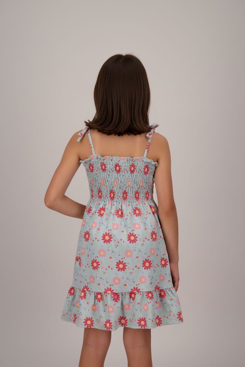 Descubra o encanto do Vestido Floral Infantil Lastex com Alças de Laço Azul Sereno da Infantil. Perfeito para sua pequena, este vestido oferece conforto e estilo com seu tecido favinho e corpo ajustado em lastex. As alças de laço e a estampa de margaridas vibrantes garantem um visual adorável, ideal para a moda infantil.