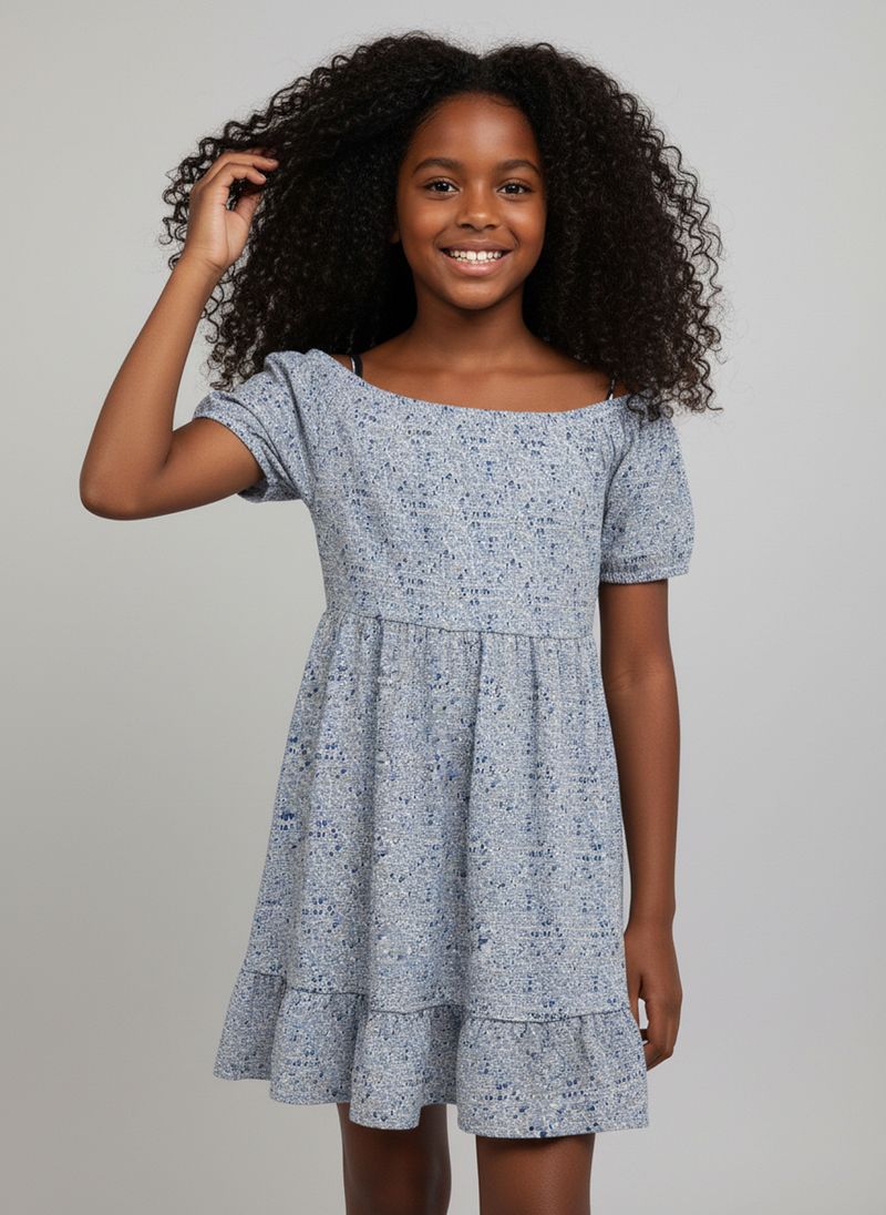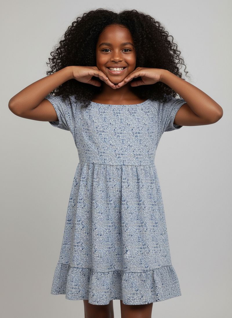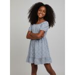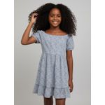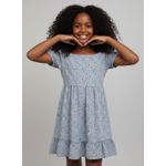 O Vestido Infantil Azul Floral, em 100% algodão e meia malha, oferece conforto e leveza. Com estampa floral, mangas bufantes e babado, garante um visual delicado e estiloso para a moda infantil.