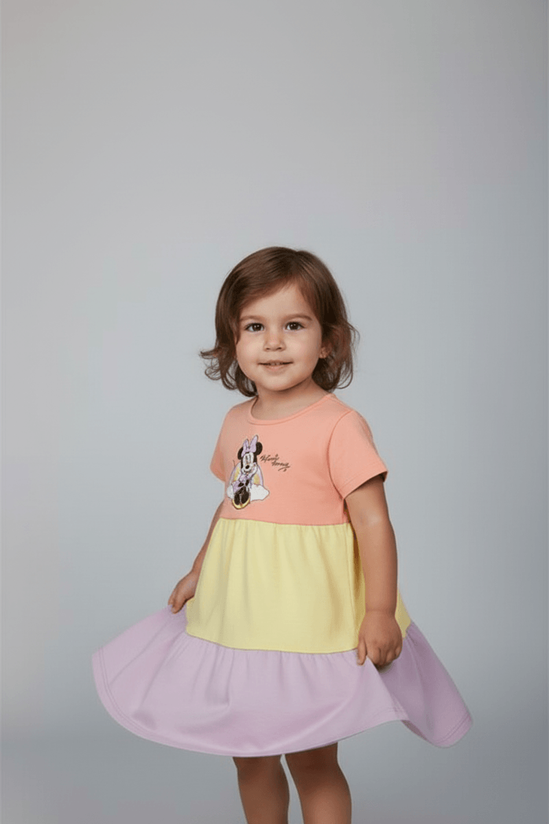 Deixe sua pequena brilhar com o Vestido Infantil Caedu Minnie Marias! Confeccionado em meia malha, oferece conforto e liberdade. Com estampa vibrante da Minnie Mouse e design de blocos de cores (pêssego, amarelo, lilás), é a escolha perfeita para um look alegre e cheio de estilo. Uma roupa infantil que une diversão e moda!